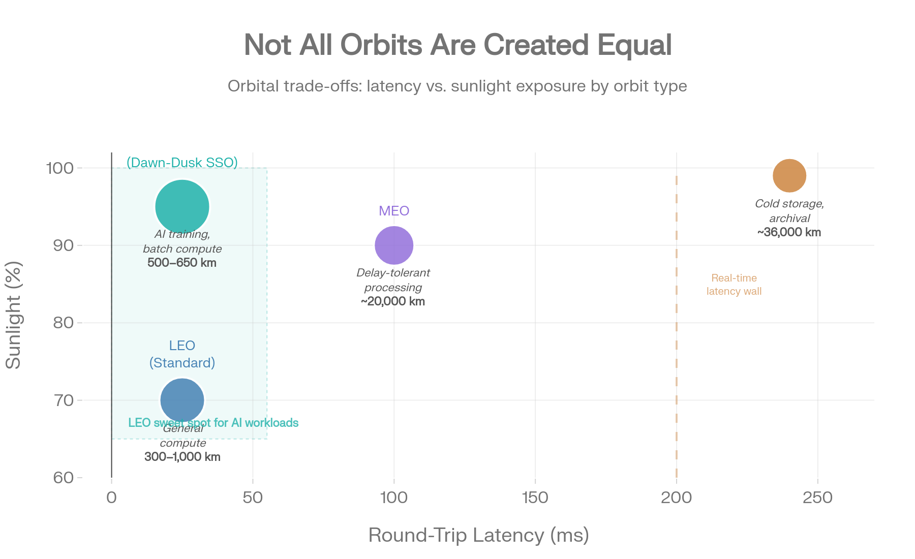 The emerging consensus favors LEO dawn-dusk sun-synchronous orbit at 500–650 km—the same zone Google is targeting for Suncatcher. It minimizes eclipse periods for near-continuous solar power, keeps latency competitive, and ensures natural deorbit within 25 years (mitigating the debris problem).