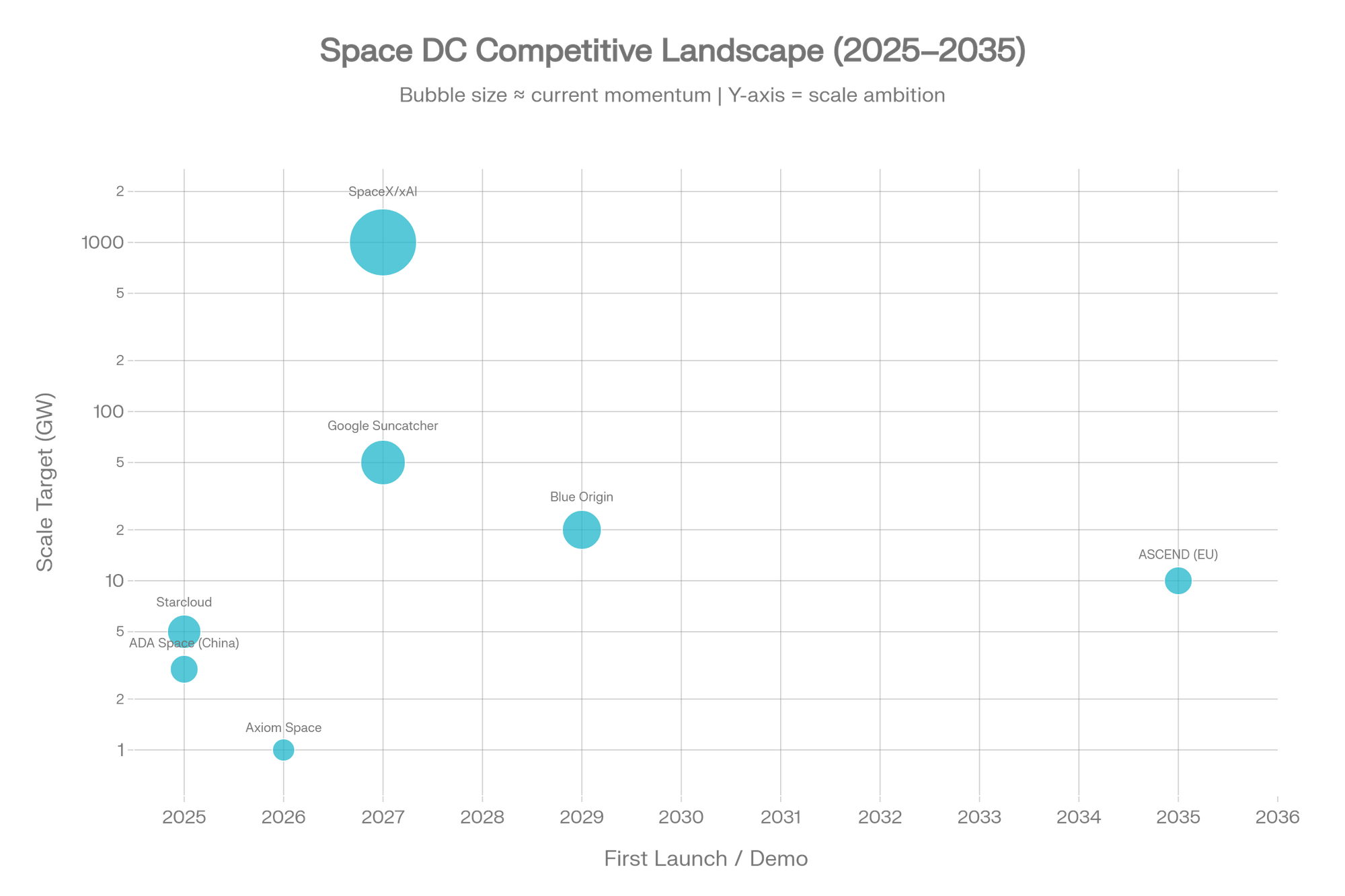 As of Feb 2026, Starcloud (YC‑backed) has flown the first H100 in orbit (Nov 2025) and is targeting multi‑GW scale by ~2030, while Google’s Suncatcher has demonstrated a 1.6 Tbps laser link and aims for a TPU constellation with launch by 2027. SpaceX/xAI has filed with the FCC for a 1M‑satellite network (Jan 2026) targeting 100 GW/year of capacity, and Blue Origin has had a dedicated team working for over a year toward a 5,000‑satellite system. Axiom Space launched the first two orbital data centers in Jan 2026 with a modular expansion roadmap, ADA Space in China has operated a 12‑sat cluster since spring 2025 toward a 2,800‑sat constellation, and the EU/Thales ASCEND program has completed its feasibility study with an EROSS robotics demo planned for 2027 and a 1 GW goal before 2050.