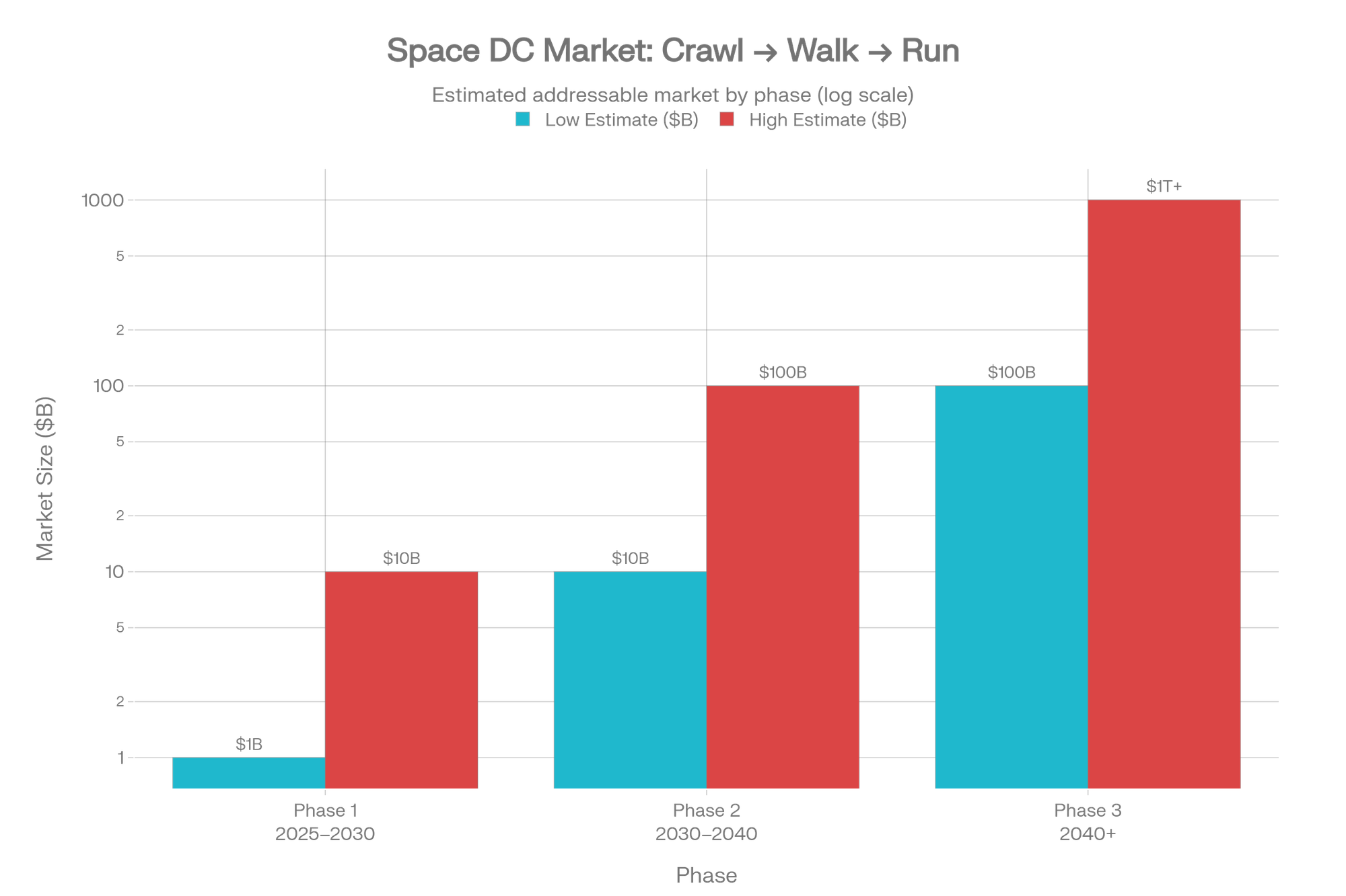 Phase 3 — Run: Megawatt-to-gigawatt-scale facilities competitive with terrestrial hyperscale on pure economic terms. Potentially a $100 billion to $1 trillion+ market. This is where the thesis either validates spectacularly or fades into aerospace history.