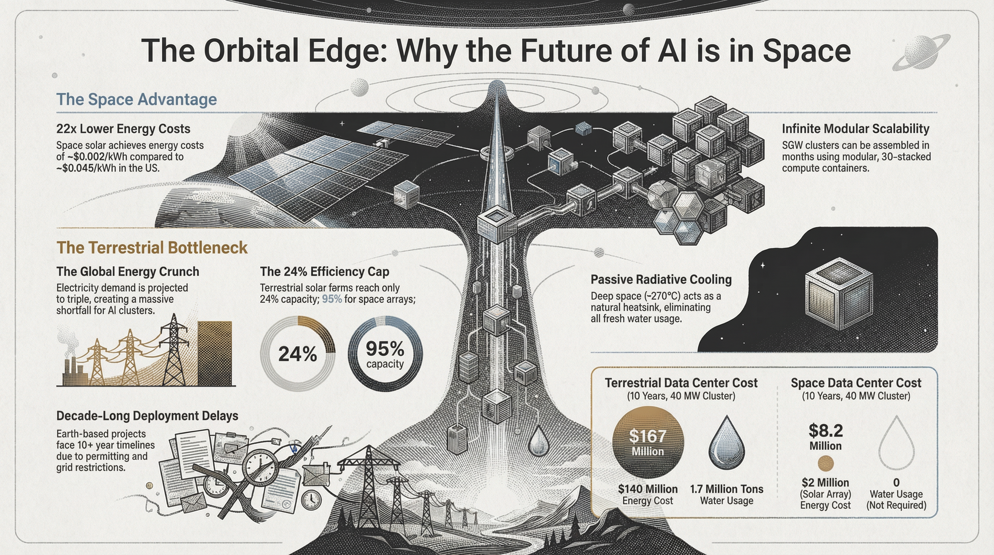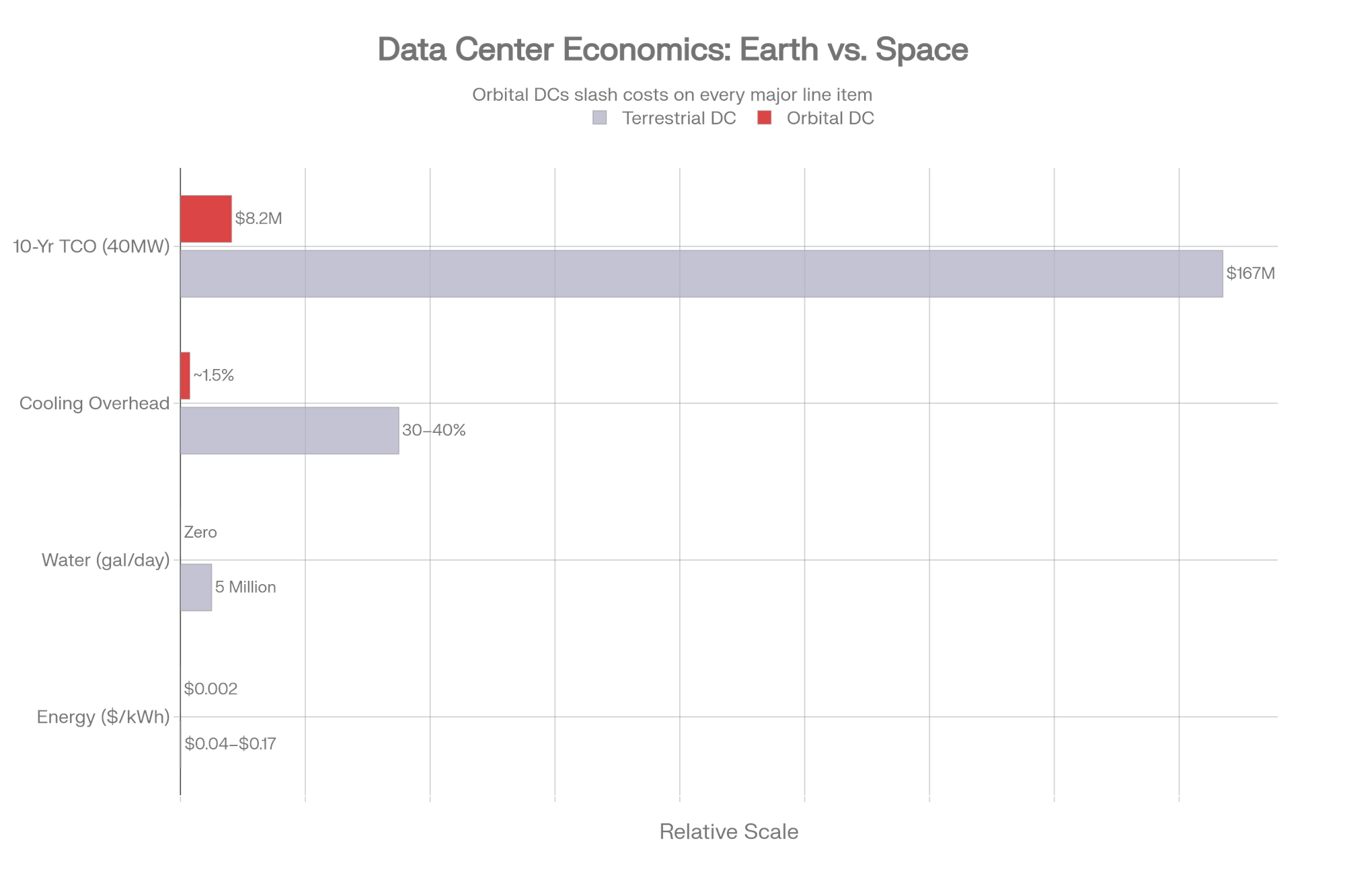 Starcloud's white paper projects that a 40 MW orbital cluster would cost $8.2 million over 10 years, versus $167 million for an equivalent terrestrial facility. Even skeptics concede the energy math is seductive.