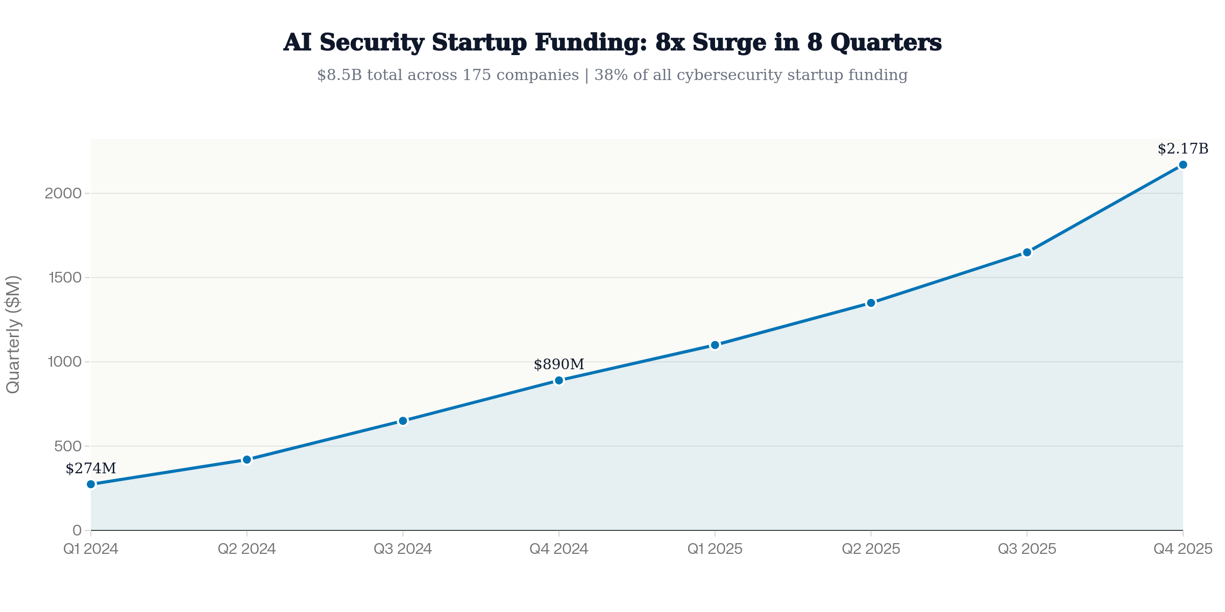 AI security funding surged from $274 million in Q1 2024 to over $2.17 billion by Q4 2025 — an 8x increase in eight quarters. AI security now represents 38% of all cybersecurity startup funding. In total, $8.5 billion was invested across 175 AI security companies during 2024–2025.