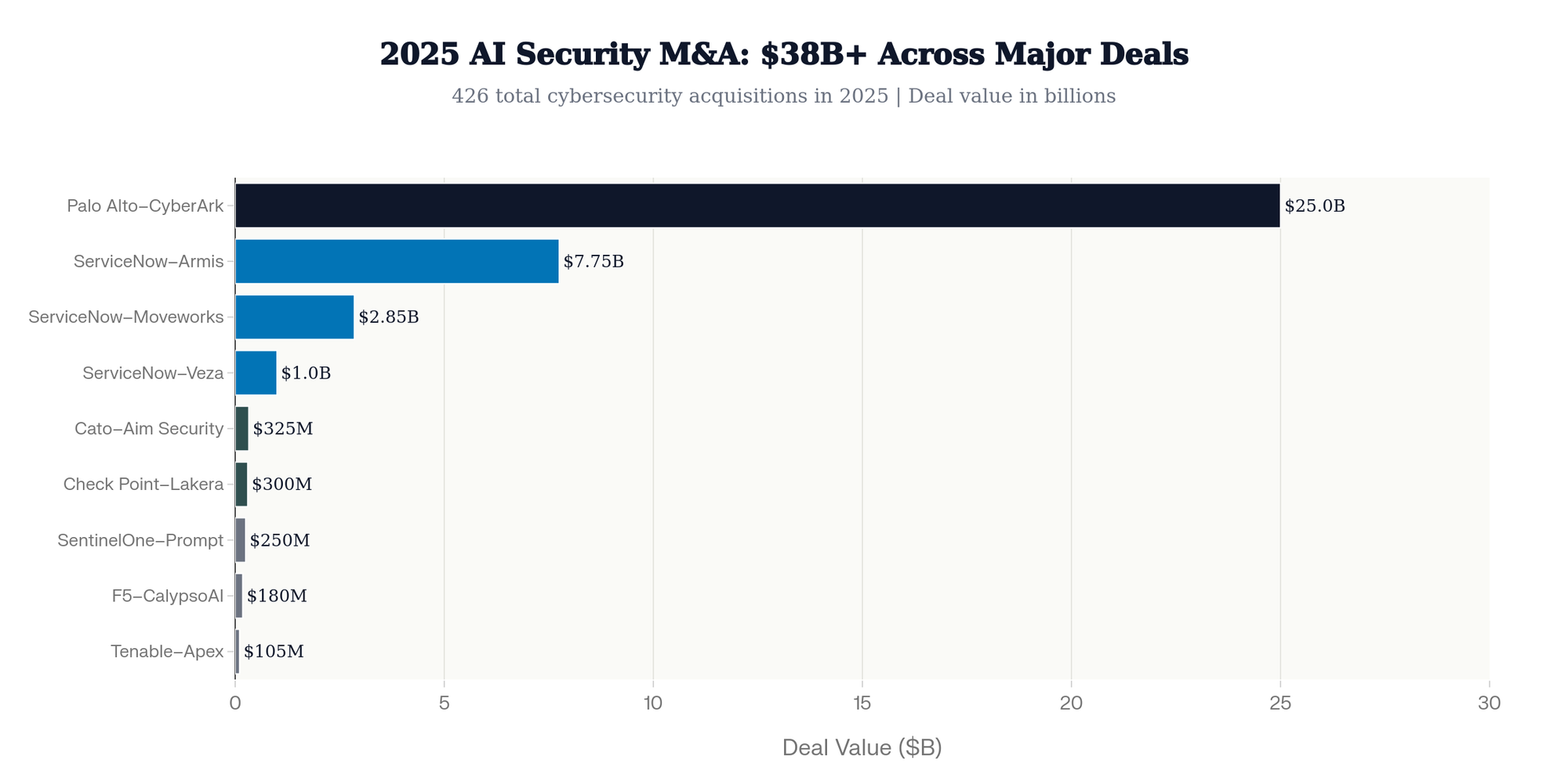 - ServiceNow spent $11.6 billion across three deals: Armis ($7.75B), Moveworks ($2.85B), and Veza (~$1B)